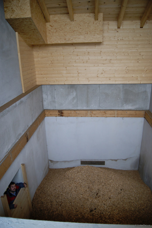 In der angrenzenden Tischlerei wurde bisher das Abfallholz in einem Stückgutkessel verfeuert. Die Tischlereiabfälle werden nun gehackt und ergeben im Jahr rund 20 m³ Hackgut für die neue Heizung – was dem Tischler außerdem pro Tag eine gute Stunde Zeitaufwand für Einheizen und Nachlegen erspart! Warmwasser gibt es dort übrigens keines, weil das der Ein-Mann-Betrieb schlicht nicht benötigt.