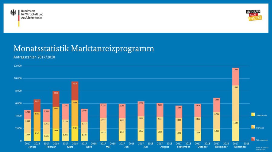 Die BAFA-Zahlen im März 2018 dürften die Ökowärmebranche erfreuen lassen. Der hohe Antragsstand aus dem Vormonat beim Bundesamt für Wirtschaft und Ausfuhrkontrolle (BAFA) hat sich nochmals um 19 Prozent erhöht.