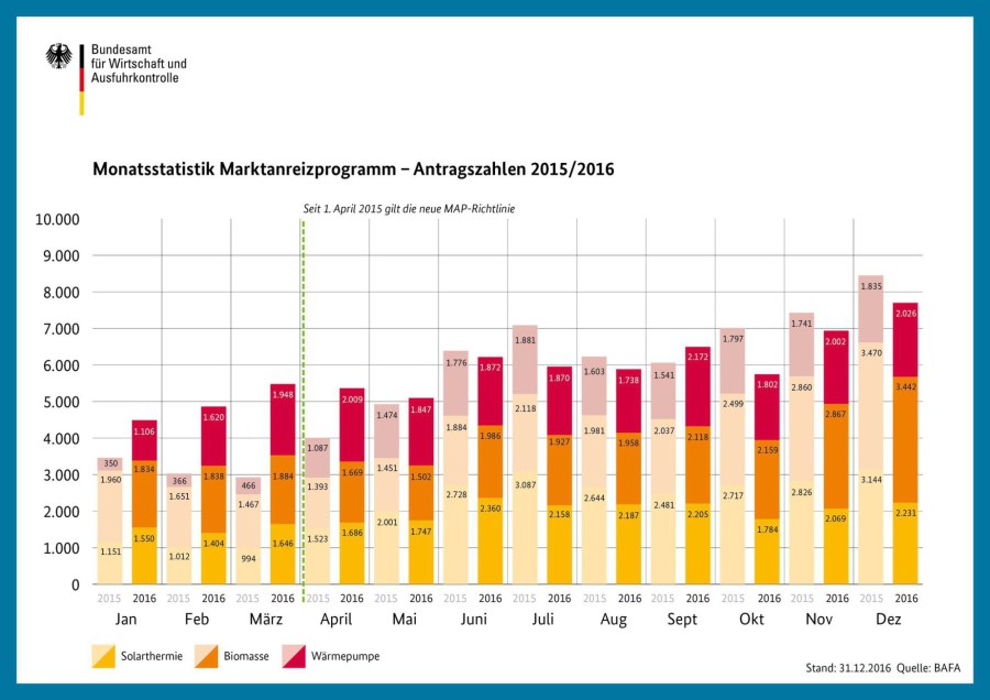 Das BAFA bezuschusst mit dem Marktanreizprogramm den Einbau von Biomasseheizungen, Solarwärmeanlagen und Wärmepumpen. Im vergangenen Jahr hatte der Bund die Förderzuschüsse im Marktanreizprogramm erhöht. So steigerte sich die Basisförderung von 36 auf 80 Euro pro Kilowatt Kesselleistung und die Mindestförderung um 600 Euro. Neu eingeführt hatte der Bund einen Zuschuss für Einzelmaßnahmen, mit denen sich die Heizung optimieren lässt. Dazu zählen unter anderem Brennstofflager, eine Schornsteinerneuerung oder der Einbau eines Pufferspeichers bei Kaminöfen mit Wassertasche. In diesem Jahr hat der Bund außerdem die Förderung über einen Zusatzbonus des Anreizprogramms Energieeffizienz (APEE) bis 2018 um weitere 20 Prozent erhöht. Weitere 600 Euro können sich Antragsberechtigte für die energetische Optimierung der gesamten Heizungsanlage im Haus sichern.