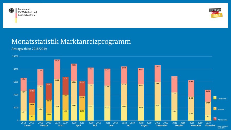 Die BAFA-Zahlen im April 2019: Die Gesamtzahl der Förderanträge für eine Ökoheizung sank mit 6.135 gegenüber März um zehn Prozent.