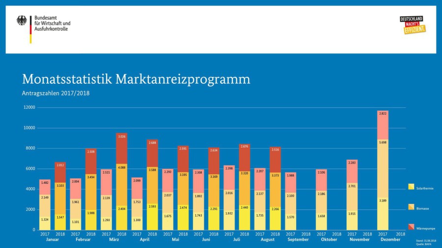Die BAFA-Zahlen im August 2018 bleiben oben. Die Zahl der Förderanträge für eine Ökoheizung sank gegenüber Juli geringfügig um drei Prozent auf 8.155.