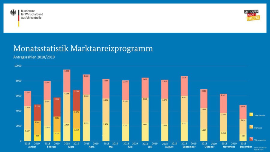 Im März 2019 gingen 2.371 Anträge auf Förderung einer Biomasseheizung im Marktanreizprogramm beim Bundesamt für Wirtschaft und Ausfuhrkontrolle (BAFA) ein. Für die Förderung einer Solarthermieanlage hat das BAFA 1.668 Anträge erhalten. Außerdem hat es 2.765 Anträge für einen Zuschuss zur Installation einer Wärmepumpe bekommen.