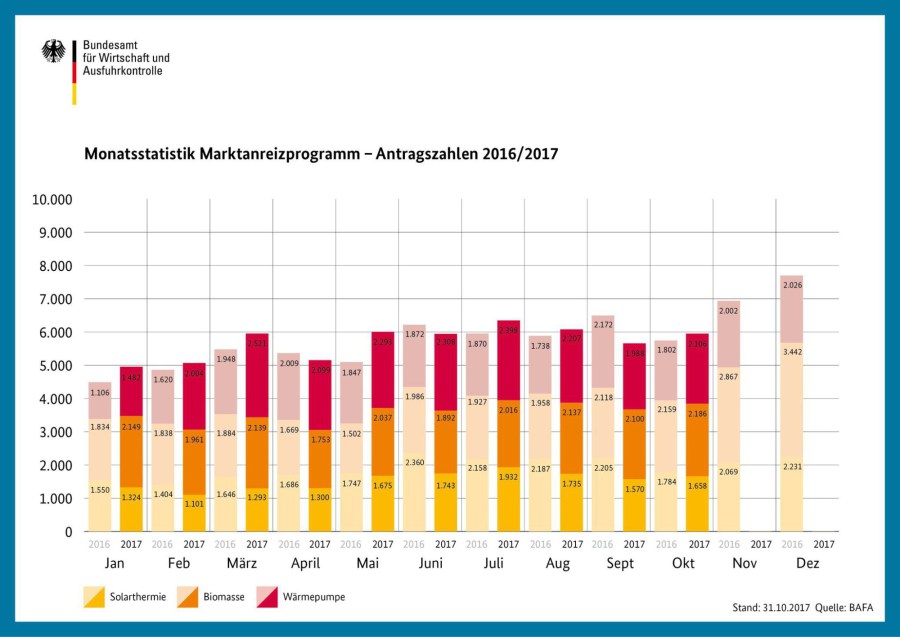 Über den Monat mit den höchsten Antragszahlen im Marktanreizprogramm kann sich die Pelletsbranche freuen. Und mit November und Dezember stehen die erfahrungsgemäß stärksten Antragsmonate noch bevor. Der Oktober war nach Januar und September der dritte Monat in diesem Jahr, in dem mehr Menschen einen Förderantrag für einen Biomassekessel als für eine Wärmepumpe gestellt haben. Dennoch kann sich die Wärmepumpenbranche über ein Plus von 17 gegenüber Oktober 2016 freuen. Weniger gut lief es für die Solarthermieindustrie. Gegenüber dem Vorjahresmonat hat sie im Oktober ein Minus von sieben Prozent hinnehmen müssen.