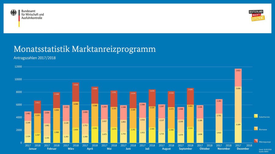 . Die Wärmepumpenbranche kann sich über eine Steigerung um 32 Prozent gegenüber dem Vorjahresmonat freuen (September 2017: 1.988 Förderanträge, September 2018: 2.626 Förderanträge).