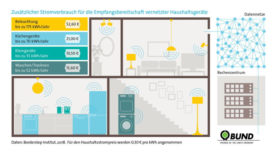 Immer mehr Geräte im Haushalt sind vernetzt. Bis 2025 ist laut BUND europaweit mit 1,7 Milliarden vernetzten Haushaltsgeräten zu rechnen, zusätzlich zu den klassischen Produkten der Informations- und Kommunikationstechnik wie Computern und Unterhaltungselektronik