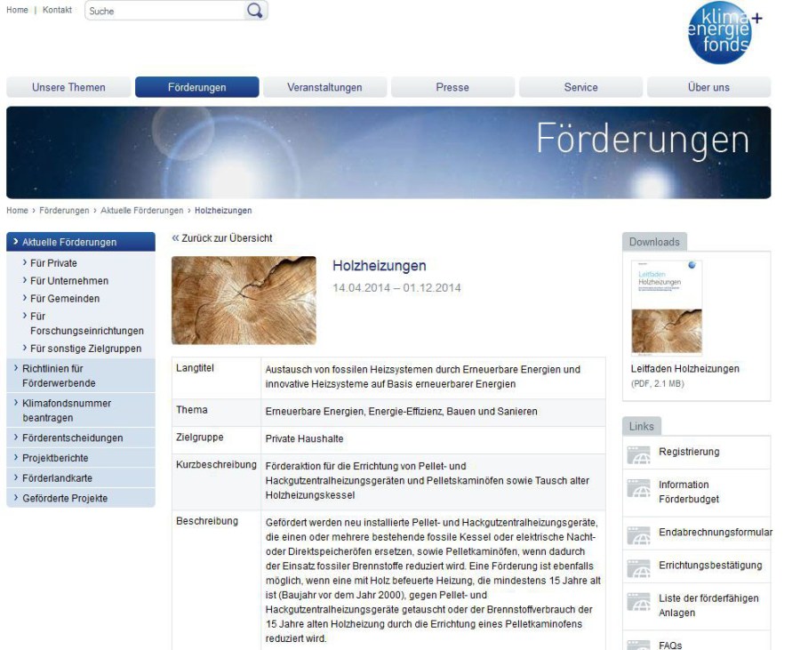 Seine Förderaktion für Holzheizungen hat der österreichische Klima- und Energiefonds in diesem Jahr mit 4,2 Millionen Euro ausgestattet. Privatpersonen ruft er auf, sich von ihren fossilen Heizungen zu trennen und auf klimaneutrale Heizungsanlagen zu setzen. Den Tausch von fossilen Zentralheizungskesseln und elektrischen Nacht-oder Direktspeicheröfen gegen moderne Holzheizkessel fördert er mit 1.400 Euro. Für neue Pelletskaminöfen gibt es 500 Euro. Neu ist, dass auch der Tausch mindestens 15 Jahre alter Holzkessel mit 800 Euro gefördert wird. Einreichungen von Privatpersonen sind bis 1. Dezember 2014 möglich.