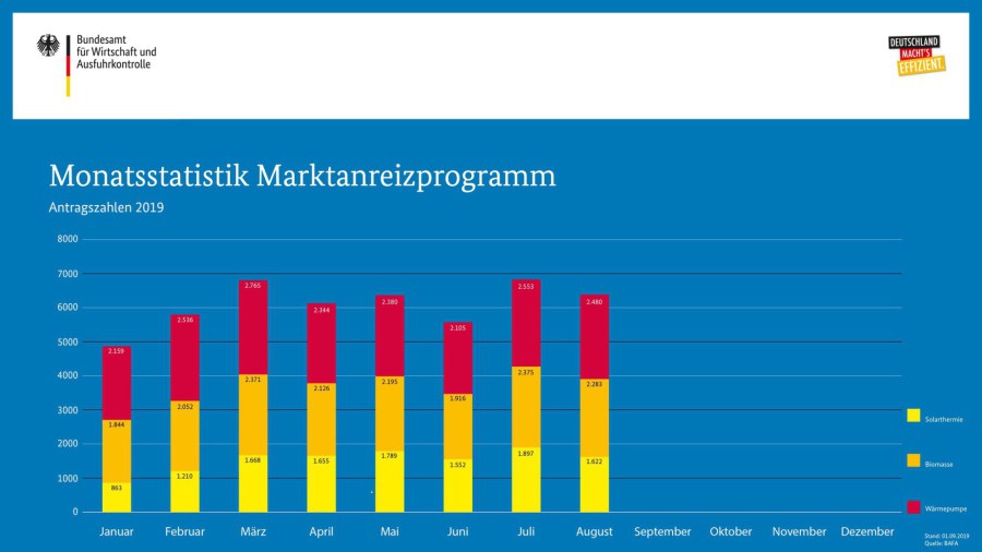 Im August 2019 gingen 2.283 Anträge auf Förderung einer Biomasseheizung im Marktanreizprogramm beim Bundesamt für Wirtschaft und Ausfuhrkontrolle (BAFA) ein. Das sind vier Prozent weniger als im Vormonat. Für die Förderung einer Solarthermieanlage hat das BAFA 1.622 Anträge erhalten. Im Juli waren es 14 Prozent mehr. Außerdem hat es 2.480 Anträge für einen Zuschuss zur Installation einer Wärmepumpe bekommen. Drei Prozent weniger als im Monat zuvor.