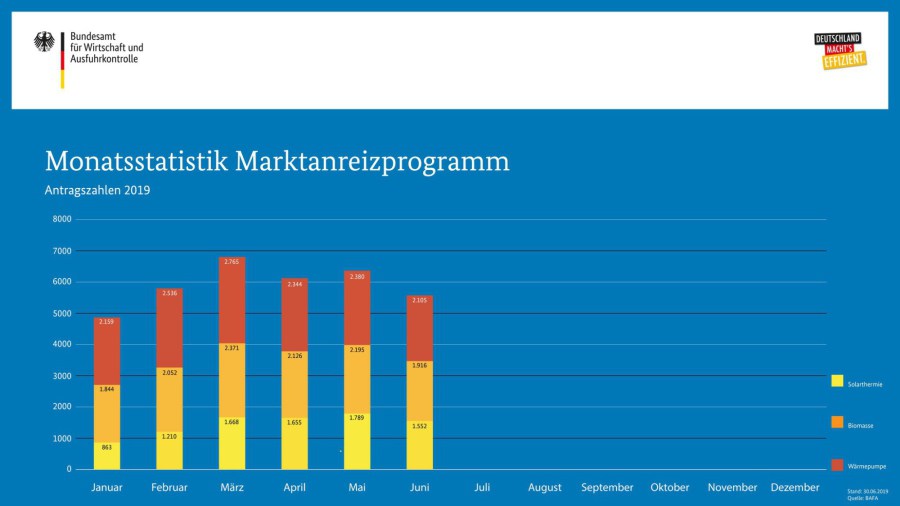 Die BAFA-Zahlen im Juni 2019: Die Gesamtzahl der Förderanträge für eine Ökoheizung fiel mit 5.573 um zwölf Prozent gegenüber Mai.