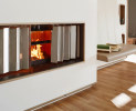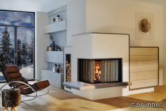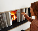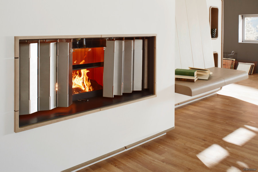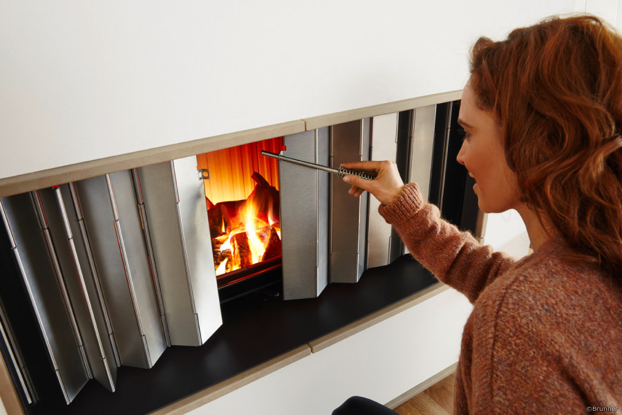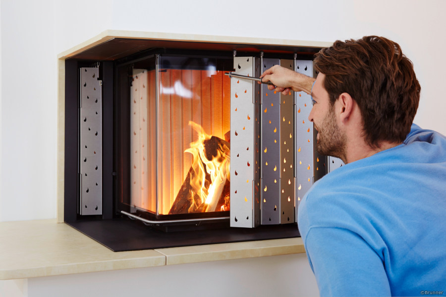 Der heatSTOP ist ein Wärmeschutzschild, das bis zu 90 % der gesamten Feuerraumstrahlung zurückhält. Die Wärme wird in den Feuerraum zurück reflektiert, also abgeschirmt. Stellen Sie sich den heatSTOP wie einen speziellen Faltvorhang aus Metall vor, der bei Bedarf vor der Glaskeramikscheibe zugezogen werden kann. Je nachdem, wie weit der heatSTOP geöffnet oder geschlossen ist, kann die Wärmeabstrahlung individuell bestimmt werden. Nicht benötigt, wird der heatSTOP in einem Aufnahmeschacht unsichtbar geparkt. Der heatSTOP ist eine echte Brunner-Konstruktion und deswegen perfekt durchdacht, langlebig und mit einer leichtgängigen Mechanik ausgestattet.