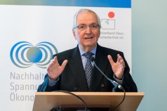 Prof. Dr. Klaus Töpfer, Exekutivdirektor des Institute for Advanced Sustainability Studies (IASS), begann mit der Erläuterung des Ursprungs des Begriffes Nachhaltigkeit und nutzte konkrete Beispiele, um die gegenwärtige Situation zu analysieren, Missstände aufzuzeigen und Lösungsansätze zu präsentieren. „Wenn wir auch zukünftig in Frieden leben wollen, müssen wir handeln und weniger privilegierte Regionen darin unterstützen, eine nachhaltige positive Wirtschafts- und Wohlstandsentwicklung zu realisieren“.