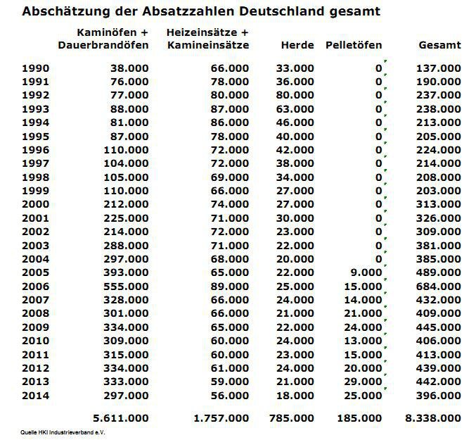 Die Absatzzahlen häuslicher Einzelraumfeuerstätten in Deutschland für die Jahre 1990 bis 2014 hat der Industrieverband Haus-, Heiz- und Küchentechnik veröffentlicht