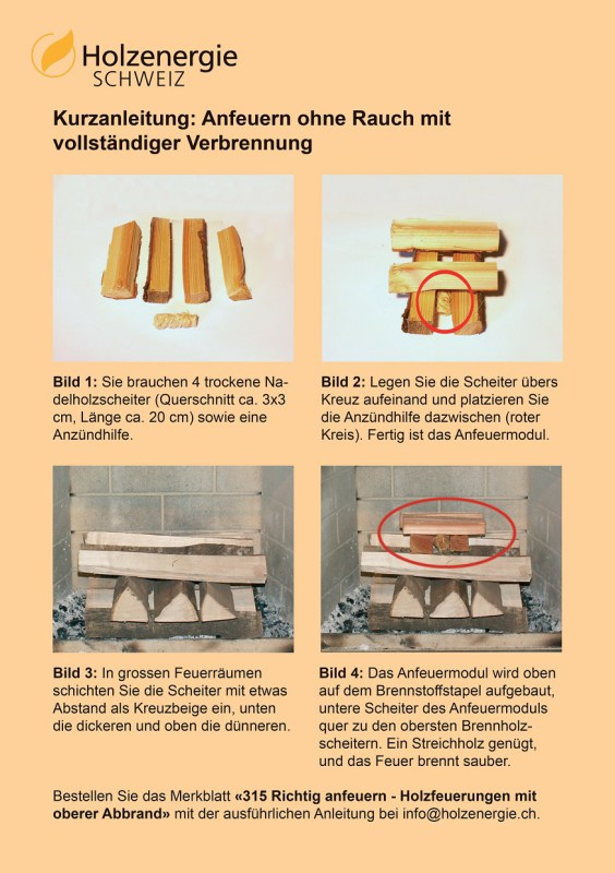 Das Merkblatt zum richtigen Anfeuern können Sie bei Holzenergie Schweiz bestellen unter www.holzenergie.ch