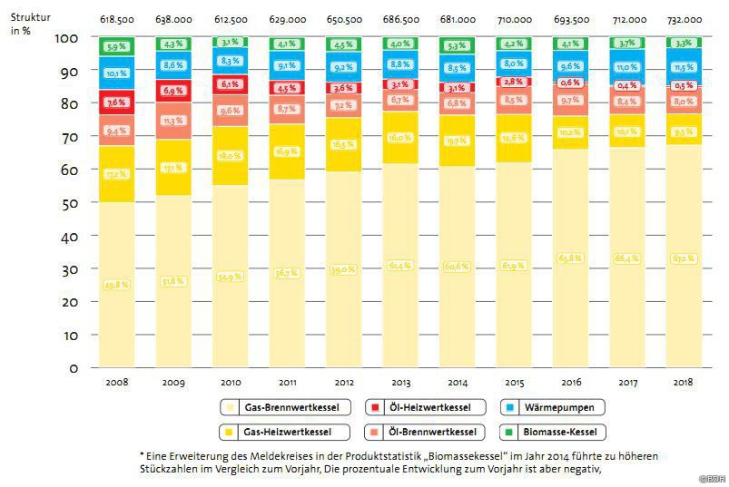 Mit 492.500 abgesetzten Geräten und einem Plus von vier Prozent gegenüber dem Vorjahr stellt die Gas-Brennwerttechnik nach wie vor die am meisten nachgefragte Heiztechnologie dar. Wärmepumpen landeten auf Platz zwei der Absatzstatistik mit 84.000 verkauften Geräten und einem Plus von acht Prozent. Danach folgt die Öl-Brennwerttechnik mit 58.500 Geräten (minus drei Prozent). Nicht zufriedenstellend lief das Geschät für die Hersteller von Biomasseheizungen. Sie mussten mit 24.000 verkauften Geräten ein Minus von neun Prozent hinnehmen. Am häufigsten wurden in diesem Segment moderne Pelletsheizungen nachgefragt (12.500 Geräte, minus drei Prozent), gefolgt von Scheitholzkesseln (8.500 Geräte, minus neun Prozent) und Hackschnitzelheizanlagen (3.000 Geräte, plus vier Prozent). Thermische Solaranlagen wurden ebenfalls weniger nachgefragt. Die abgesetzte Kollektorfläche lag mit 573.500 Quadratmetern acht Prozent unter dem Ergebnis von 2017.
