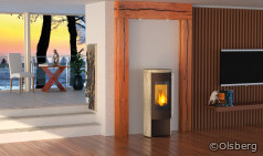 . Der belüftete Türgriff erlaubt eine komfortable Bedienung. Für noch mehr Komfort lässt sich die optional erhältliche elektronische Ofensteuerung OEC installieren. Für die externe Verbrennungsluftzuführung ist hinten am Gerät ein Anschlussstutzen vorgesehen. Den Merapi gibt es in verschiedenen Ausführungen: Vom Grundgerät mit Stahlverkleidung in schwarz über eine Variante mit dem Naturstein Serpentin bis zur Sandstein-Ausführung stehen unterschiedliche Modelle zur Wahl.