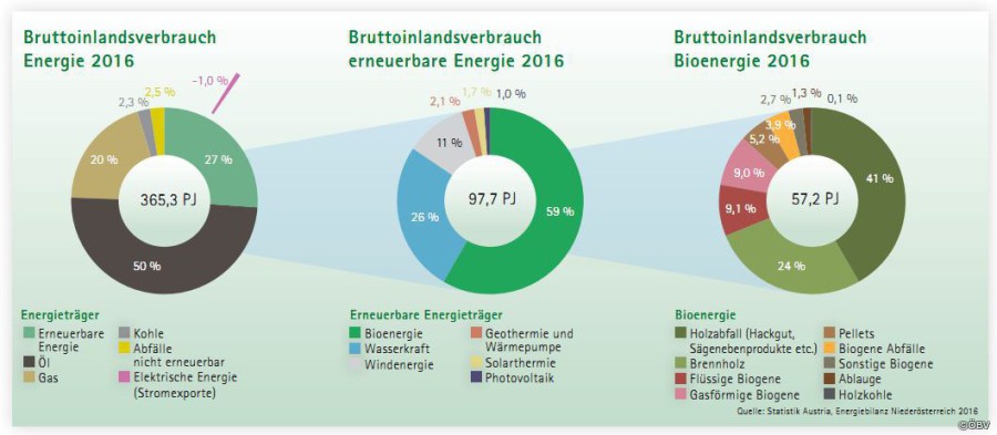 Niederösterreich weist den höchsten Bruttoinlandsverbrauch an Energie im Land auf und verbraucht über ein Viertel der Energie der Republik. Seit 1988 ist sein Energieverbrauch um fast 60 Prozent angestiegen. Erdöl dominiert mit einem Anteil von 50 Prozent. Mit der Raffinerie in Schwechat versorgt sich das Land zu 16 Prozent aus eigener Erdölproduktion. Die Erdölraffinerie ist für 15 Prozent der Treibhausgasemissionen des Bundeslandes verantwortlich. Der Anteil erneuerbarer Energien am Endenergieverbrauch liegt mit 34,3 Prozent etwas über dem Österreichschnitt. Mit 59 Prozent ist Biomasse die wichtigste erneuerbare Energie, der vierthöchste Wert unter allen Bundesländern. Zwischen dem Jahren 1988 und 2016 hat sich der Einsatz von Bioenergie fast verdreifacht. Während der Brennholzverbrauch in der Zeit etwas gesunken ist, verzwanzigfachte sich die Nutzung biogener Brenn- und Treibstoffe. Wichtigste Sortimente sind Hackgut und Sägenebenprodukte mit 41 Prozent, gefolgt von Brennholz (24 Prozent), Biotreibstoffen (9,1 Prozent) und Biogas (neun Prozent).