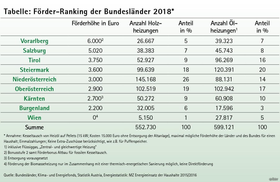 Nachdem Kärnten jahrelang das Ranking gewonnen hat, löst es in diesem Jahr Vorarlberg ab. Das Bundesland vergibt bei einem Heizungstausch von Öl auf Holzpellets einen Zuschuss von bis zu 6.000 Euro. Es hat allerdings auch Nachholbedarf. Außer in Wien liegt der Anteil der Holzheizungen so niedrig wie in Vorarlberg mit fünf Prozent. Hinter Vorarlberg unterstützt in diesem Jahr besonders Salzburg einen Kesseltausch. Die Fördersummer liegt bei 5.020 Euro. Auf dem dritten Rang folgt Tirol mit 3.750 Euro Förderung, dicht gefolgt von der Steiermark mit 3.600 Euro. Niederösterreich (3.000 Euro), Oberösterreich (2.900 Euro) und Kärnten (2.700 Euro) liegen in der Förderrangliste für Pelletsheizungen knapp hintereinander. Im Burgenland gibt es dagegen nur 2.200 Euro. Immer noch mehr als in Wien, das keine Förderung gewährt. Für seine Förderrangliste für Pelletsheizungen hat der Verband eigene Berechnungen durchgeführt. Als Grundlage dienten die Kosten von 15.000 Euro für einen 15-Kilowatt-Pelletskessel sowie die optimale Erfüllung aller Fördervoraussetzungen.