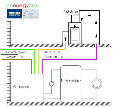Die Kombiheizung ist laut Bioenergy 2020+ so für den Winterbetrieb konzipiert, dass die Wärmepumpe die warme Umluft in der Kachelofenhülle nutzt und die Energie an den Heizkreis abgibt. Für die Übergangszeit und den Sommerbetrieb ist eine automatische Umschaltung zwischen Kachelofenumluft und Außenluft über eine Regelungseinrichtung und einen Luftumschaltkasten vorgesehen. Die Strahlungswärme des Kachelofens bleibt bei dem Konzept erhalten. “Es findet eine kontinuierliche Energieabfuhr aus der Kachelofenhülle statt, dadurch wird eine Überhitzung der Wohnräume vermieden”, heißt es in der Veröffentlichung von Bioenergy 2020+. Über die Regelung der Wärmepumpenleistung lasse sich die Oberflächentemperatur des Kachelofens einstellen. Für hohe Wirkungsgrade und eine kontrollierte Wärmeabgabe an den Aufstellraum sorgen beim Kachelofen ein Keramik-Modulspeicher, eigens angepasste Luftumlenkungen in der Kachelofenhülle und speziell für Niedrig- und Passivhaus entwickelter Kaminbauplatten
