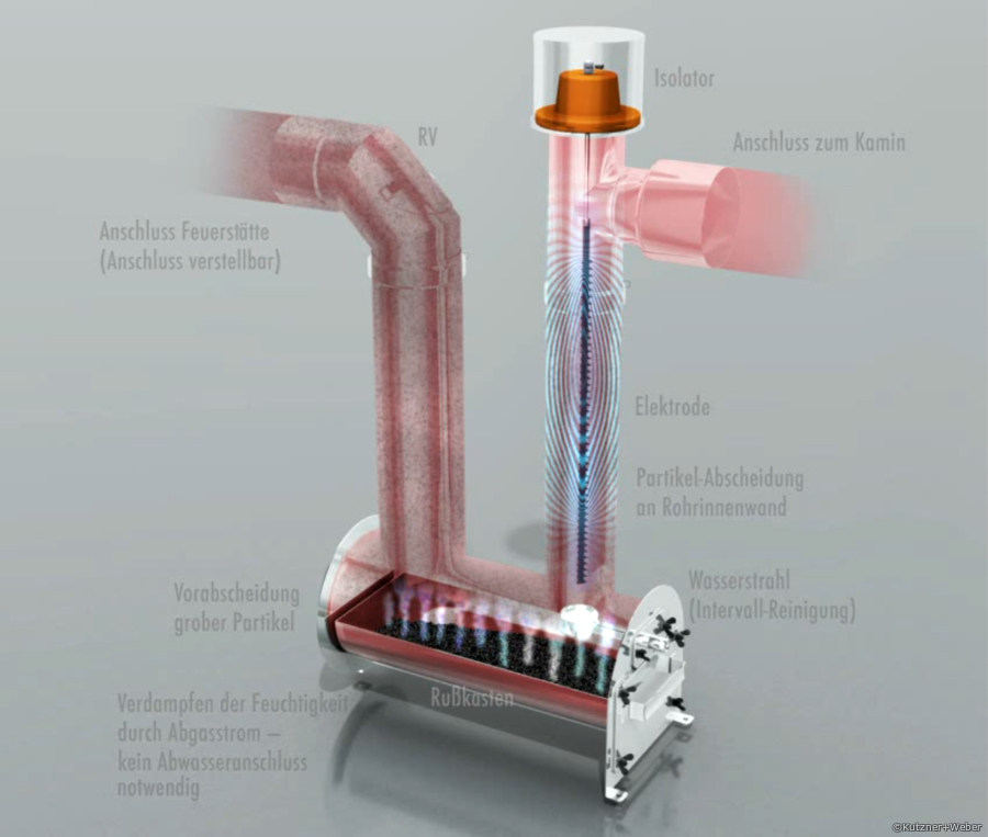 Das System reinigt sich automatisch. In regelmäßigen Abständen von einigen Stunden sprüht es einen Wasserstrahl in das Rohr. Dafür braucht es einen Wasseranschluss mit mindestens 2,5 bar Druck. Ein Abwasseranschluss ist dagegen nicht nötig. Das heiße Abgas, das durch den Abscheider strömt, trocknet das Reinigungswasser. Die Staubpartikel sammeln sich in der Rußschublade, die sich von Hand entleeren lässt