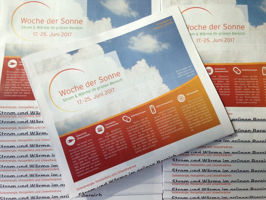 Die Woche der Sonne 2017 steht unter dem neuen Motto “Strom & Wärme im grünen Bereich”. Vom 17. bis 25. Juni werden sich Bürgerinnen und Bürger deutschlandweit bei lokalen Veranstaltungen über erneuerbare Energien informieren können.”Die Kampagnenzeitung gibt wie jedes Jahr einen umfangreichen Überblick über die erneuerbaren Technologien und ist für angehende Selbstversorger und Heizungstauscher eine spannende Lektüre”, erläutert Bentele. Sie liefere wichtige Informationen über Holzpellets, Solarenergie, Speicher und Wärmepumpen, illustriere ihren Einsatz mit vielen Anwendungsbeispielen und biete ausführliche Hinweise zur staatlichen Förderung. Die Zeitung ist in Paketen mit jeweils 80 Exemplaren erhältlich. Organisatoren von Veranstaltungen für die Woche der Sonne 2017 können Sie im www.bsw-solar-shop.de bestellen.