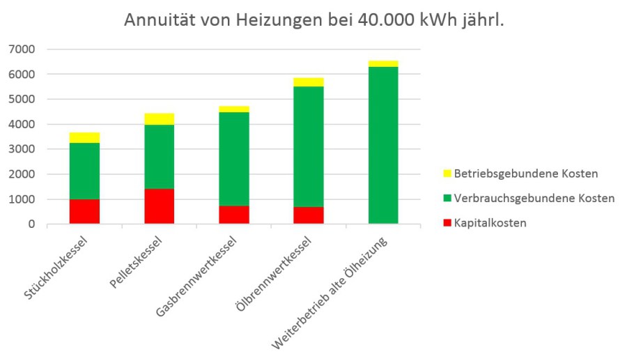 Dieser Kostenvergleich ergab, dass der Weiterbetrieb einer alten Ölheizung jährlich EUR 4.845,- und der Betrieb einer modernen Holzheizung lediglich EUR 3.004,- pro Jahr kosten würden, was einer jährlichen Ersparnis von EUR 1.841,- entspricht. Die Umrüstung von einer alten Ölheizung auf einen neuen Ölbrennwertkessel ergäbe eine jährliche Einsparung von lediglich EUR 300,-. Die Gesamtkosten eines neuen Ölbrennwertkessels liegen im Vergleich zu jenen einer Stückholzheizung um jährliche EUR 1543,- höher.